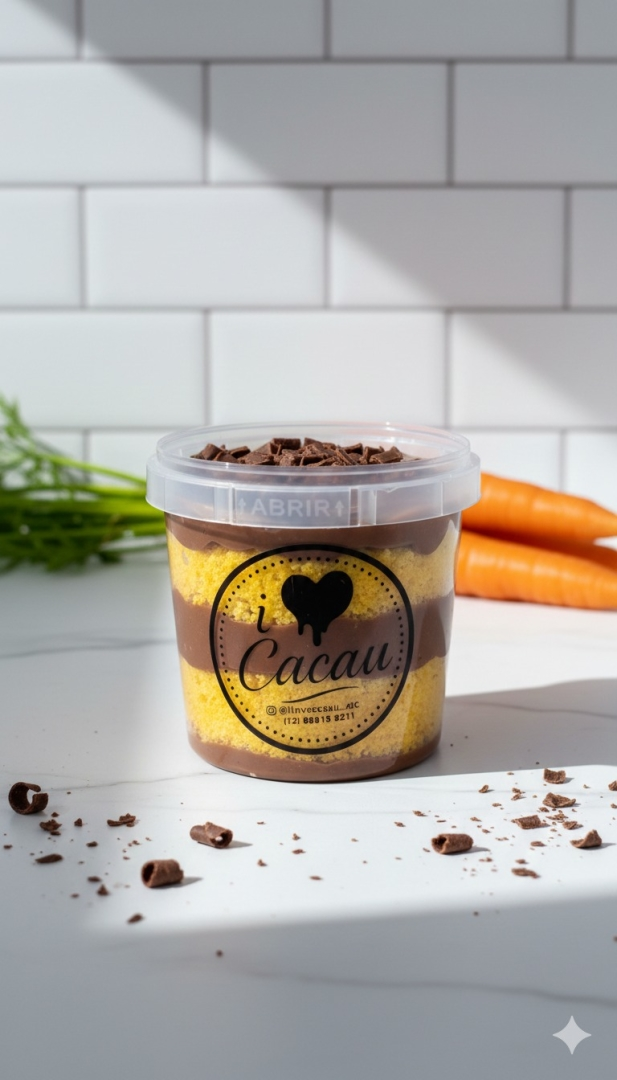 Bolo de pote com massa de cenoura fofinha, um recheio de brigadeiro caseiro com cacau 50% e granulado belga. Pesando em média 200g